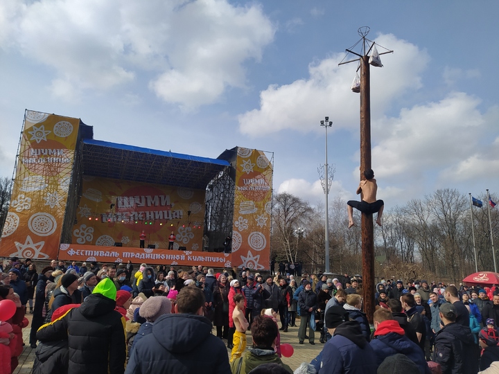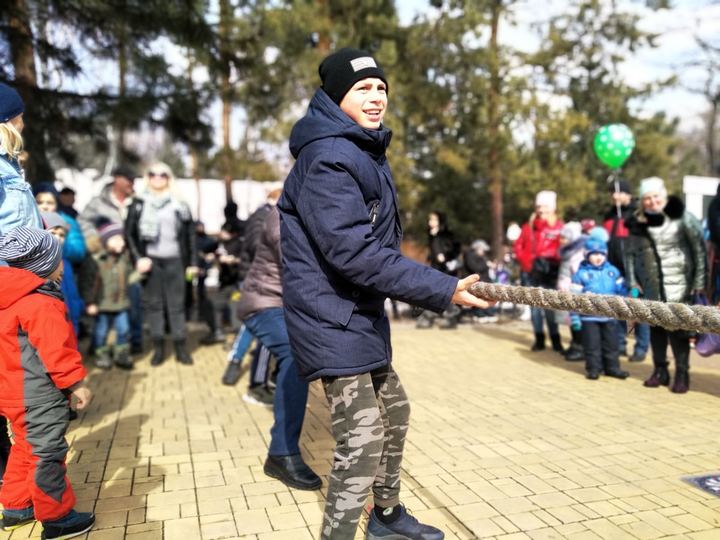 Здесь народные гуляния начались в 12 часов дня. Взрослые и дети уже смогли попробовать покорить масленичный столб. На его вершине были закреплены пакеты с подарками, но чтобы добраться до них, понадобилась недюжинная ловкость. Интересно, что большинство призов досталось мальчишкам.