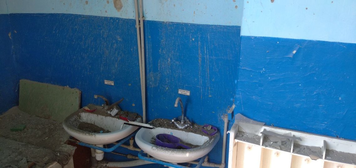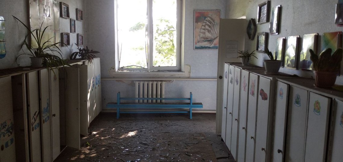 В здании выбиты окна, стены изнутри и снаружи посечены осколками.