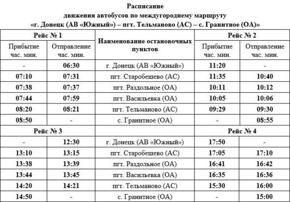 В министерстве добавили, что автобус отправляется из Донецка с автовокзала «Южный». Доезжать до Гранитного согласно расписанию он будет по вторникам и пятницам.