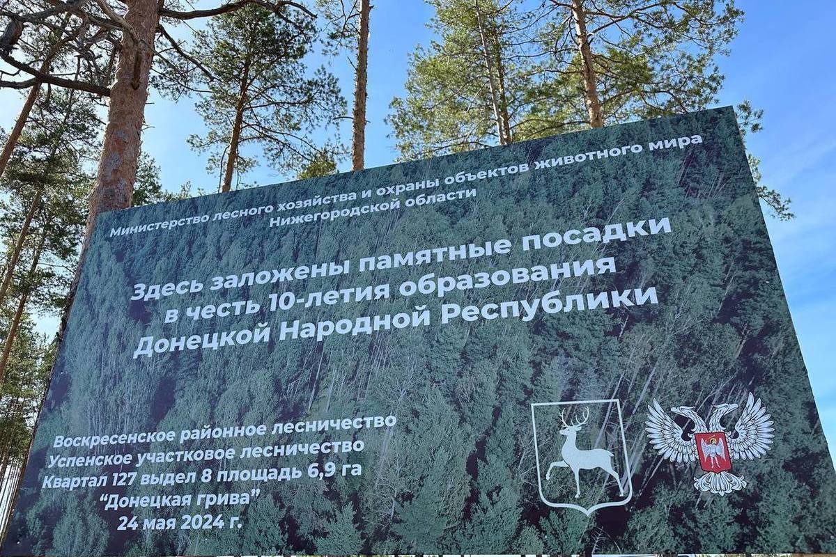 В честь десятилетия ДНР в Нижегородской области появилось урочище “Донецкая грива”, где волонтеры, активисты и представители местной власти на территории почти в 7 гектаров высадили 27 тысяч саженцев молодых сосен.