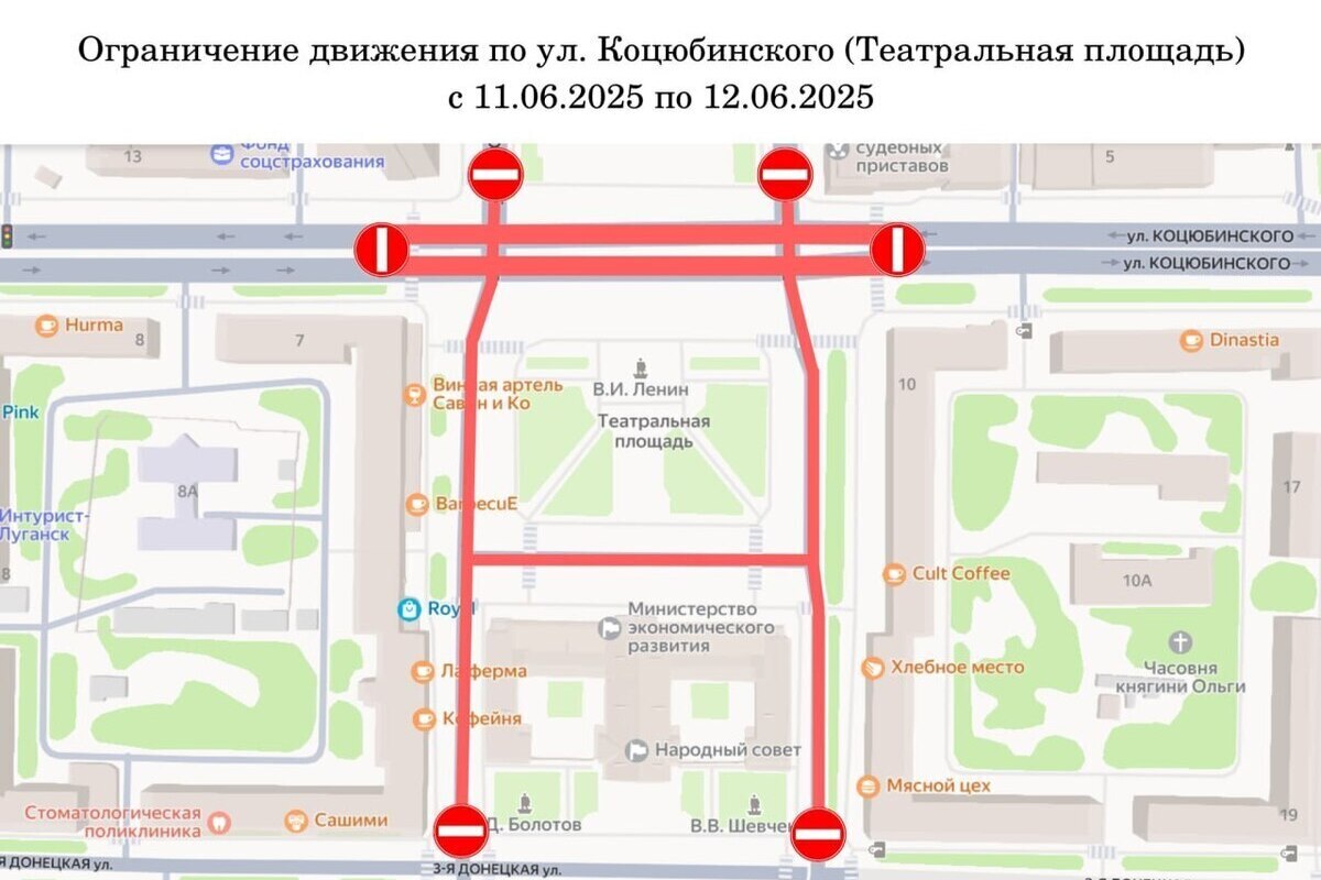 С 8 по 15 июня в центре Луганска, на Театральной площади, будет приостановлено движение транспорта. Временные ограничения связаны с проведением приуроченных ко Дню России мероприятий.